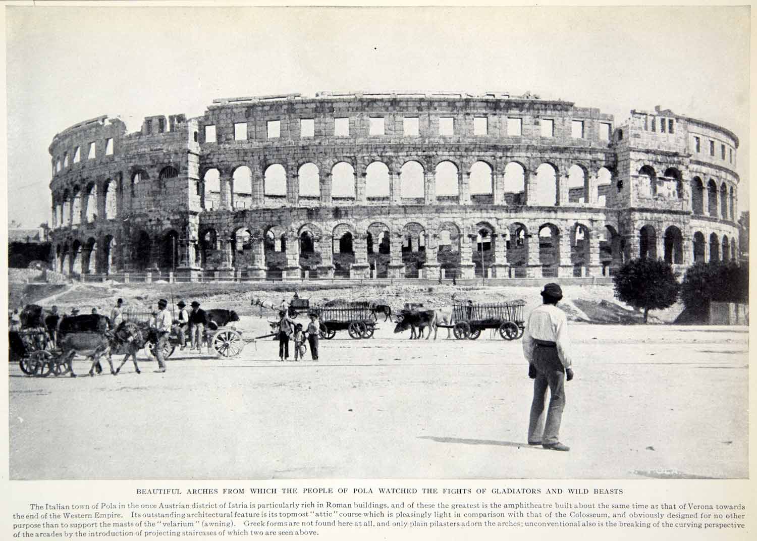 This is an original 1924 black and white halftone print of the "Beautiful Arches of the Pola Amphitheatre," from which the people of Pola watched the fights of gladiators and wild beasts.