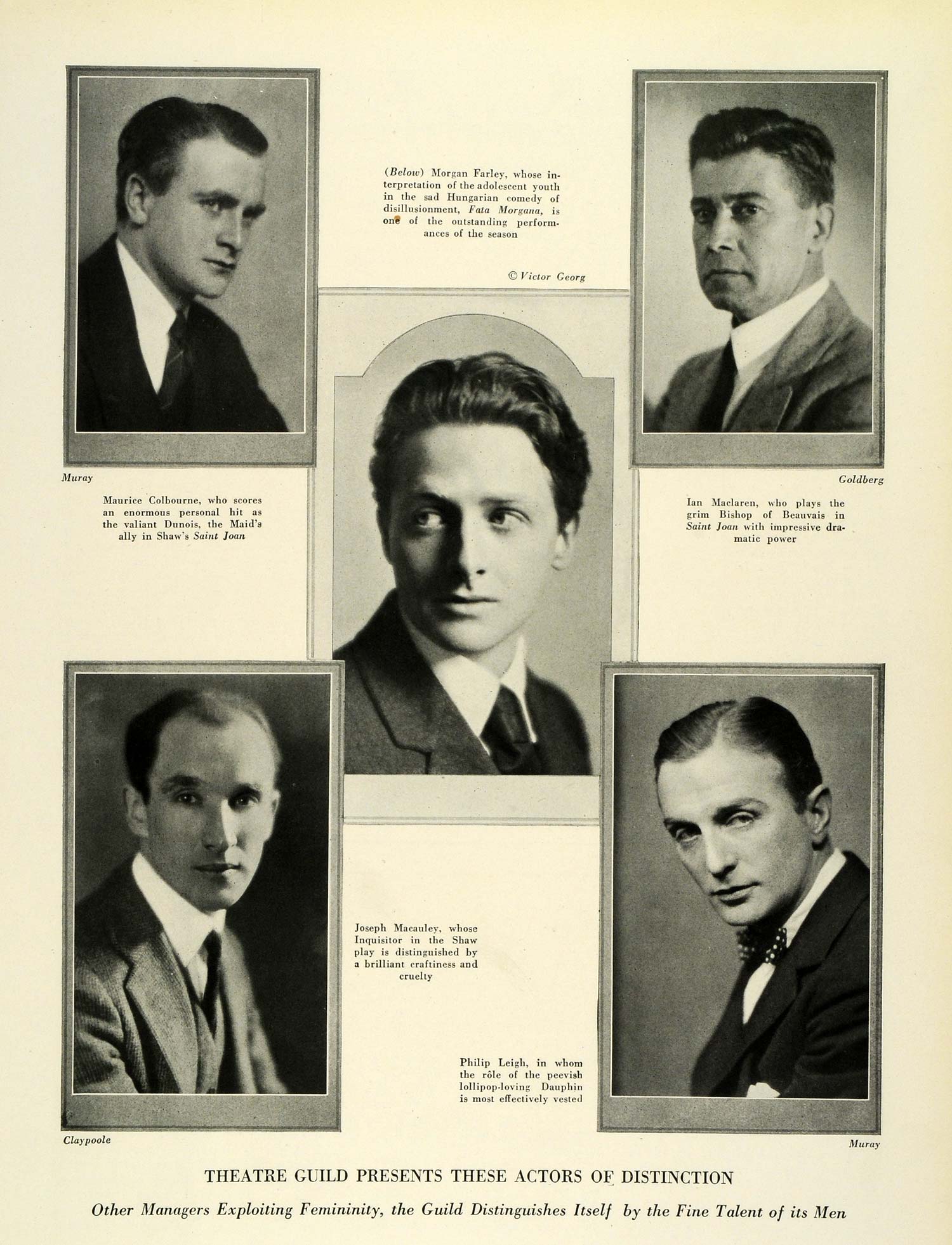 This is an original 1924 halftone print of various actors, including Maurice Colbourne, Morgan Farley, Ian Maclaren, Joseph Macauley and Philip Leigh. Hits mentioned include, "Saint Joan," and "Fata Morgana." Photography by Muray, Victor Georg, Goldberg, and Claypoole.
