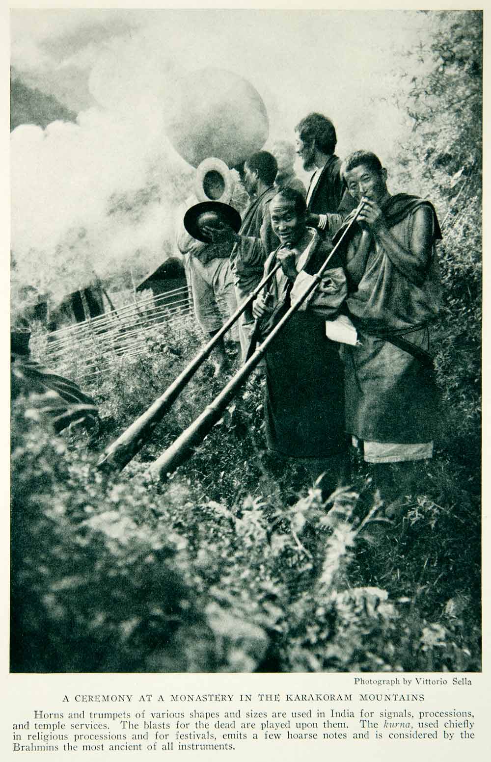 This is an original 1924 duotone halftone print of a horn ceremony at an Indian monastery in the Karakoram Mountain Range.