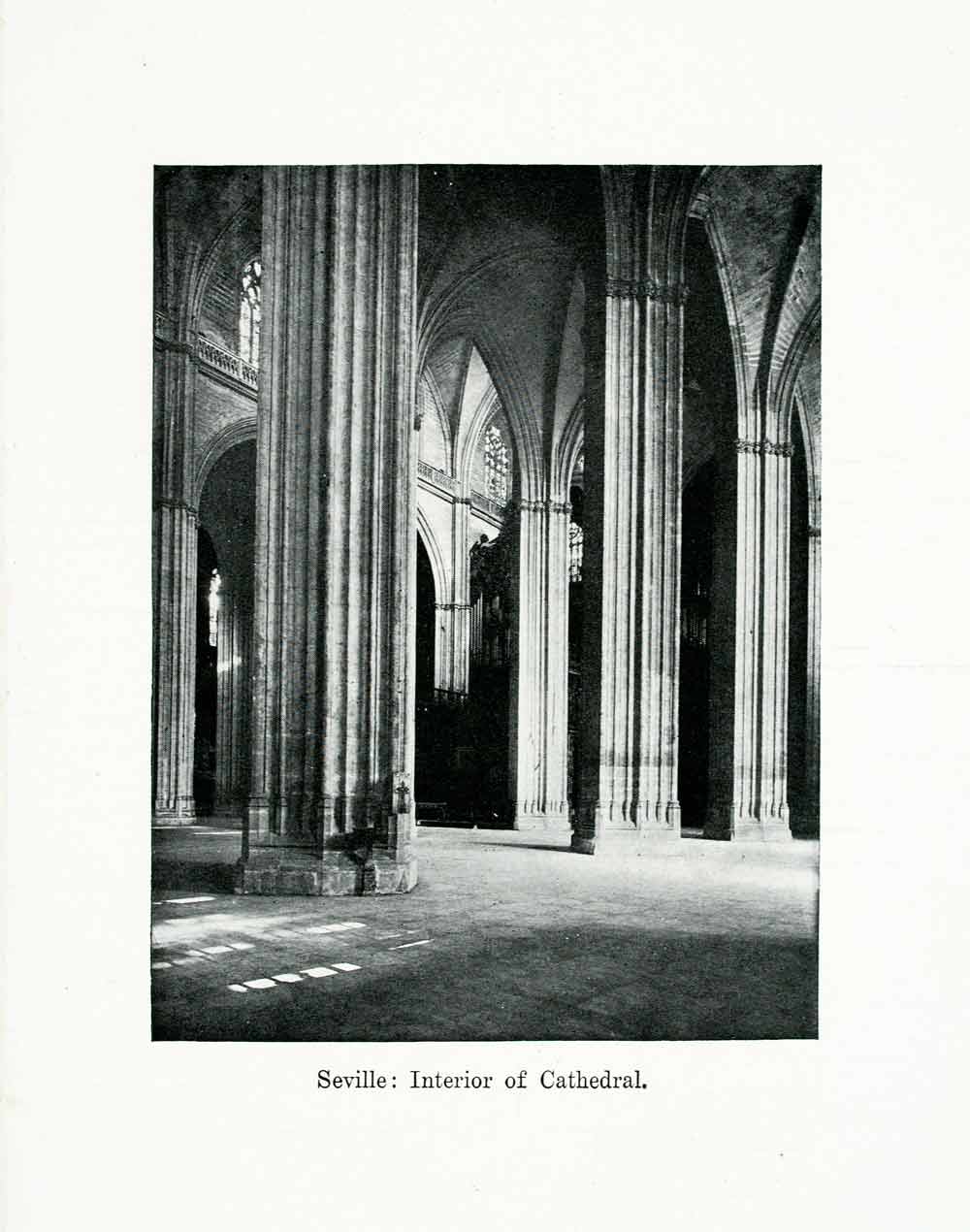 This is an original 1924 black and white halftone print of the interior of a cathedral in Seville, Spain.