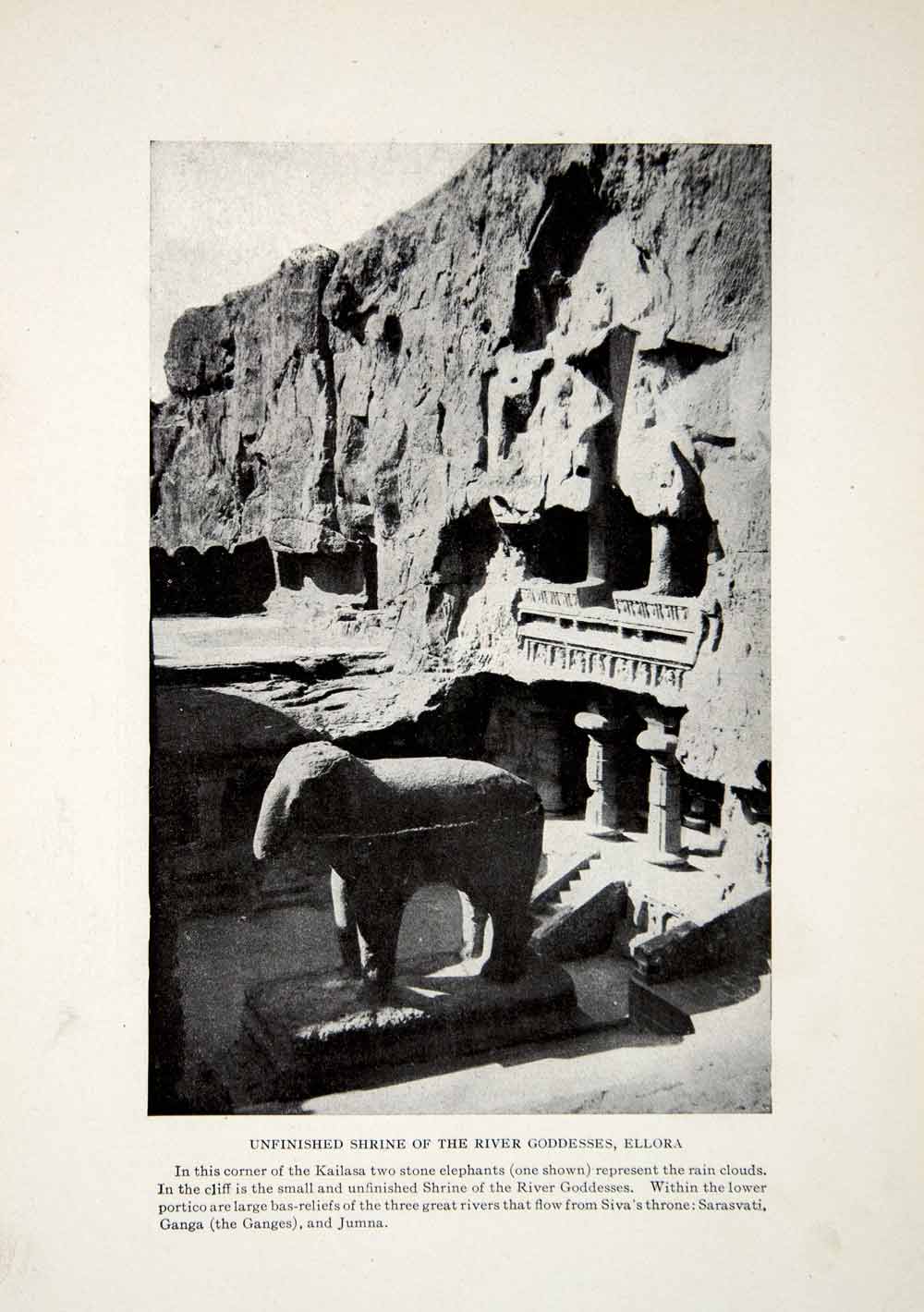 This is an original 1924 black and white halftone print of the "Unfinished Shrine of the River Goddesses in Ellora," in India.