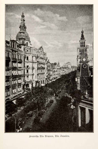 This is an original 1924 black and white halftone print of a street called Avenida Rio Branco in Rio de Janeiro, Brazil. Originally called Avenida Central, this avenue goes straight through the center of the city, and is a hotspot of many social and political events.