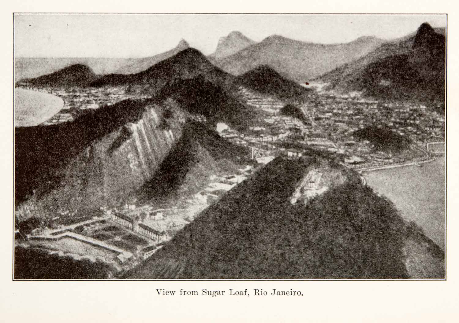 This is an original 1924 black and white halftone print of Rio de Janeiro from the crest of Sugarloaf Mountain in Brazil.