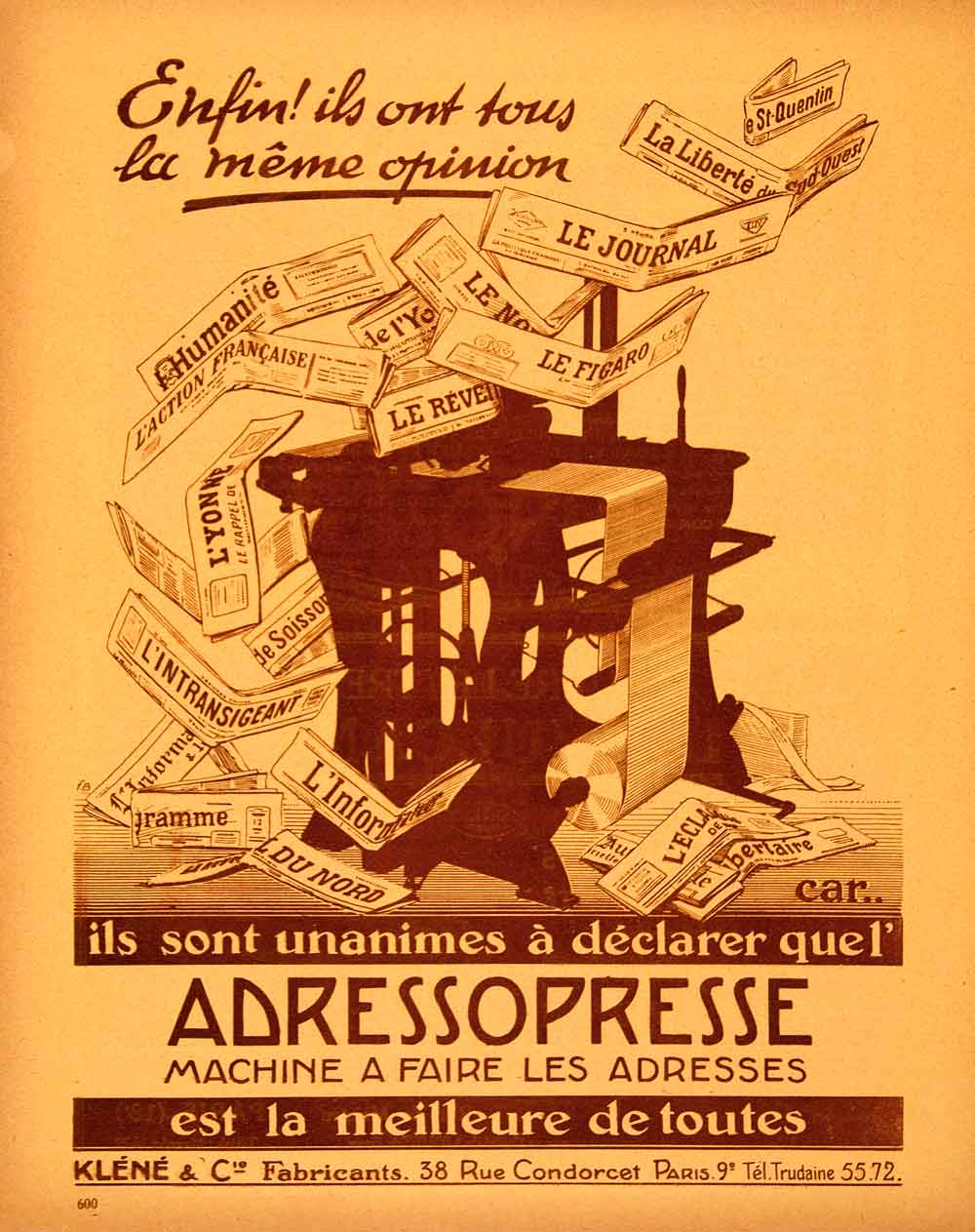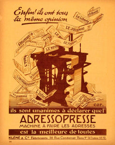 This is an original 1925 monochrome print ad for the Adressopresse (Addressograph), manufactured by Kléné & Cie at 38 Rue Condorcet, Paris. Big names in newspapers such as Le Figaro, L'Intransigeant and L'Action Française all gave it a positive review.