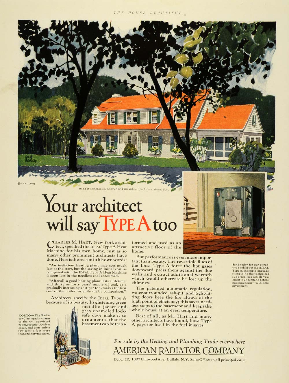 This is an original 1925 color print ad for the Ideal Type A Heat Machine, a product by the American Radiator Company, located at 1807 Elmwood Avenue in Buffalo, New York. This particular ad features the home of architect Charles M. Hart in Pelham Manor, New York.