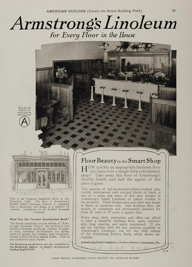 This is an original 1925 black and white print ad for Armstrong's Linoleum from the Armstrong Cork Company of Lancaster, Pennsylvania. The ad includes a very nice image of the storefront and interior of the Simpson Sandwich Shop in San Francisco which has the Armstrong Marble Inlaid Linoleum, Pattern 71 as its flooring.