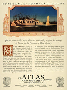 This is an original 1925 color print ad for the Atlas Cement Company of 25 Broadway in New York. This ad features their Portland Cement, as well as a fountain statue sculpted by Mr. Lorado Taft.