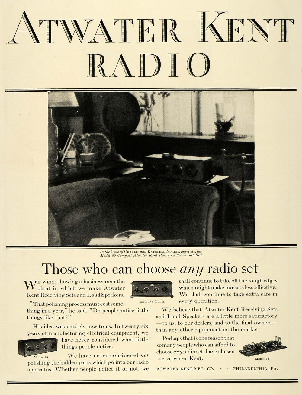 This is an original 1925 black and white print ad for the Atwater Kent Manufacturing Company of Philadelphia, Pennsylvania. This ad features their Atwater Kent Radios, as used in the home of the novelists Charles and Kathleen Norris.