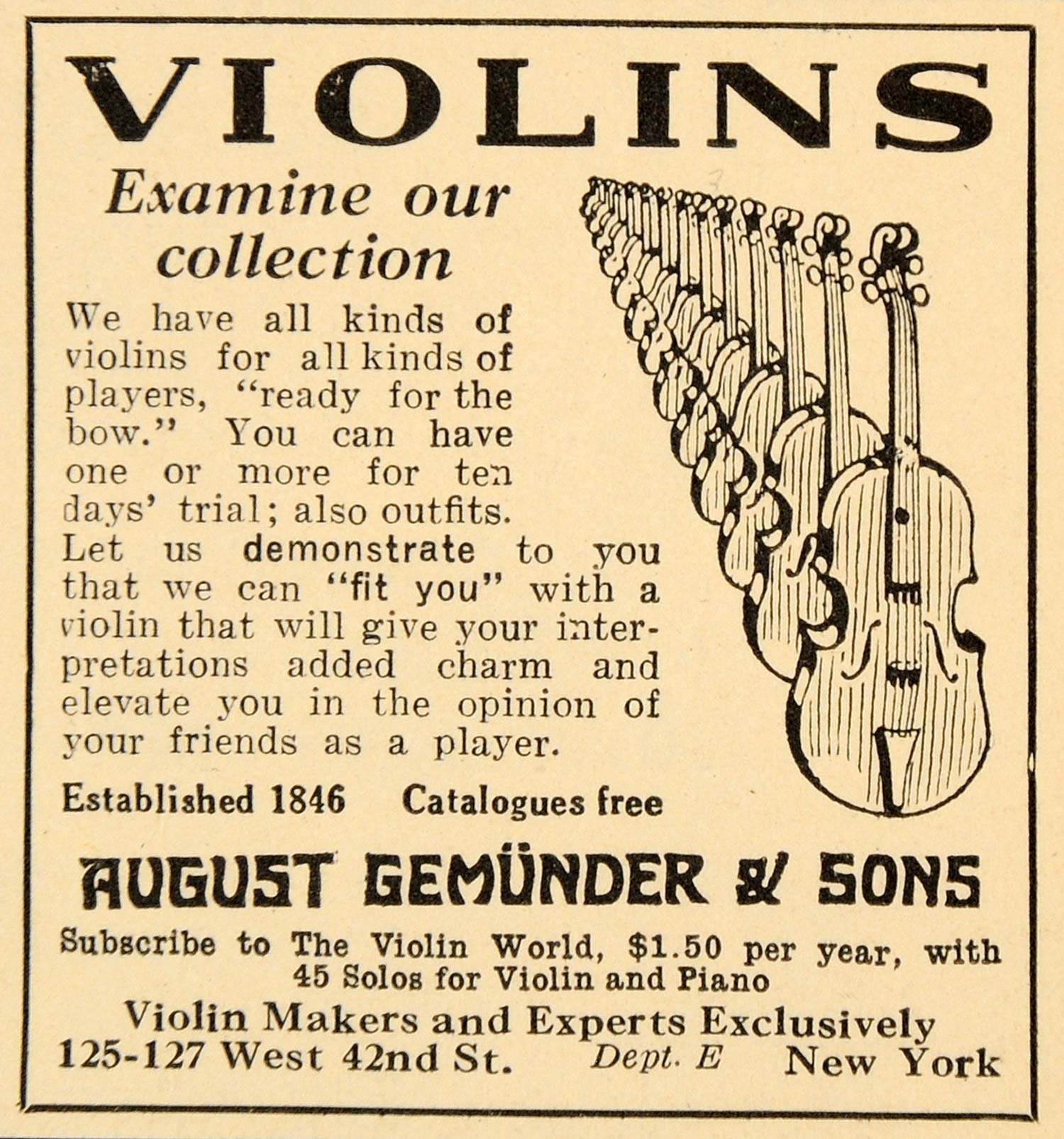 This is an original 1925 black and white print ad for August Gemunder & Sons Violin Makers and Experts located at 125-127 West 42nd St., New York. Interesting promotion to subscribe to The Violin World which promoted solos for violins and piano.