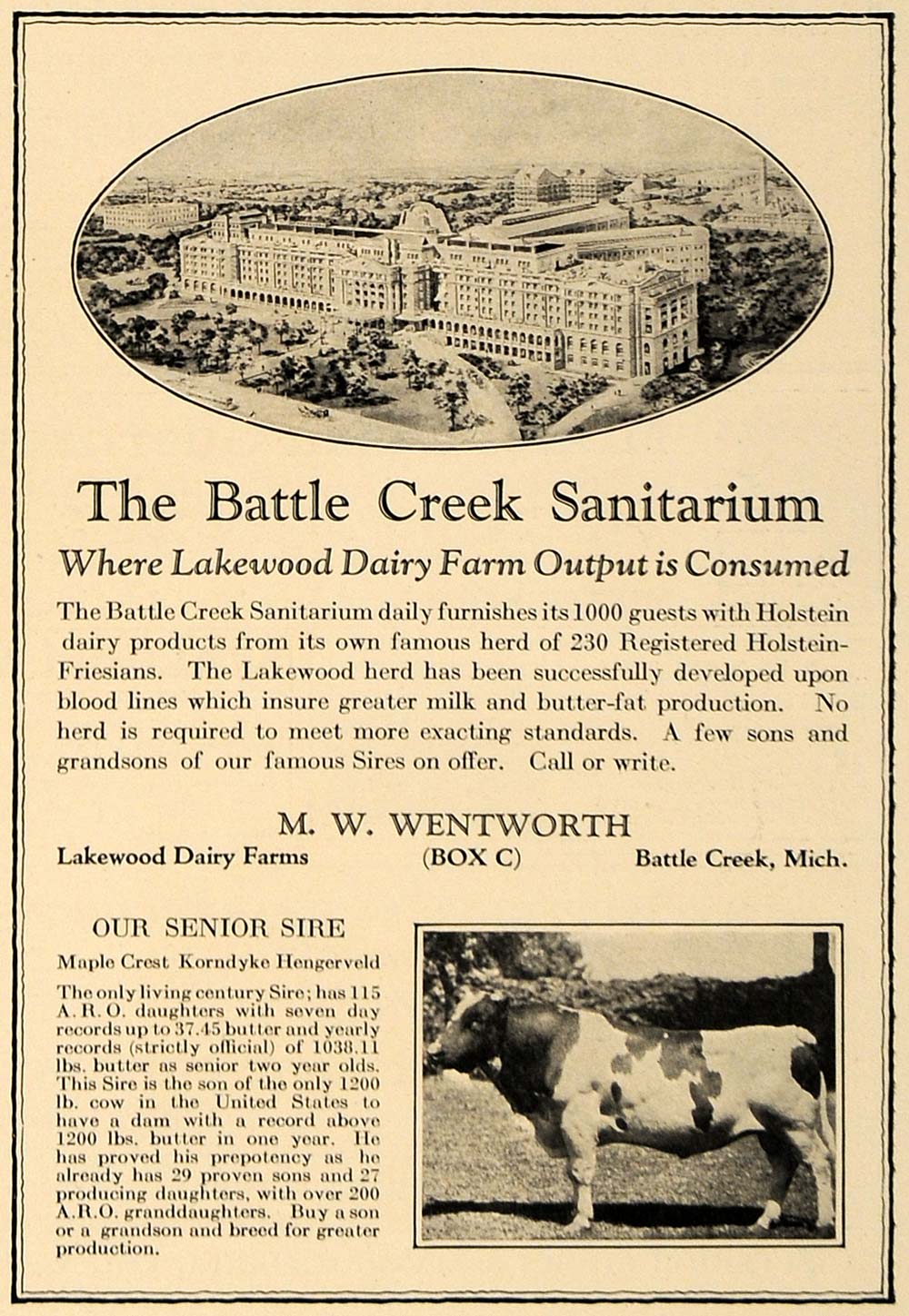 This is a rare original 1925 black and white print ad for the Battle Creek Sanitarium where Lakewood Dairy Farm output is consumed. This ad is by M. W. Wentworth of Battle Creek, Michigan.