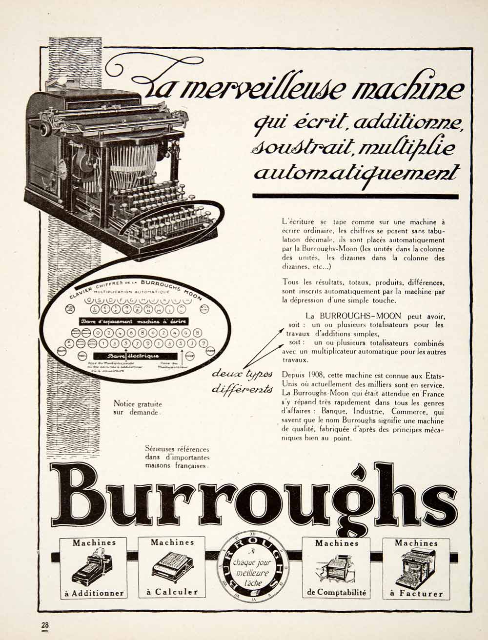 This is an original 1925 black and white print ad for the Burroughs typing and calculating machines.