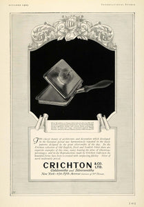 This is an original 1925 black and white print ad for Crichton & Company, Ltd., of 636 Fifth Avenue in New York; this ad features their gold and silversmith artistic home dinnerware and decor.