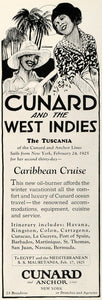 This is an original 1925 black and white print ad for the Cunard and Anchor Cruise Lines of 25 Broadway in New York. This ad features their cruises to the West Indies and the Caribbean.