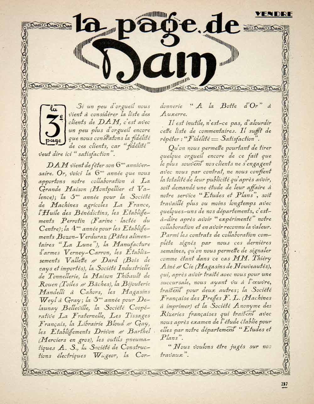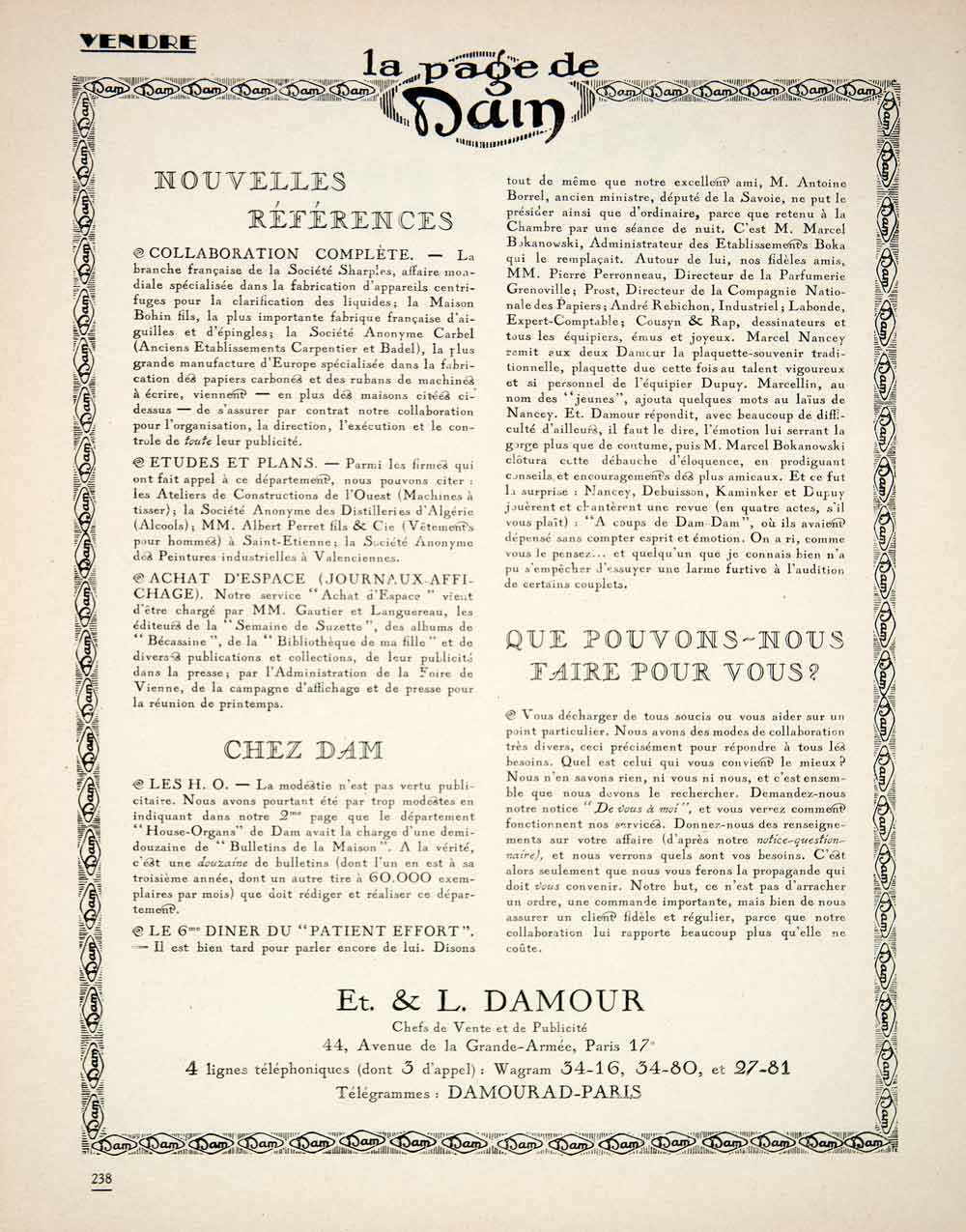This is an original 1925 two-page black and white print ad (one double-sided page) for Dam, an extremely well-respected French advertising agency based in Paris and run by Etienne and Leon Damour.