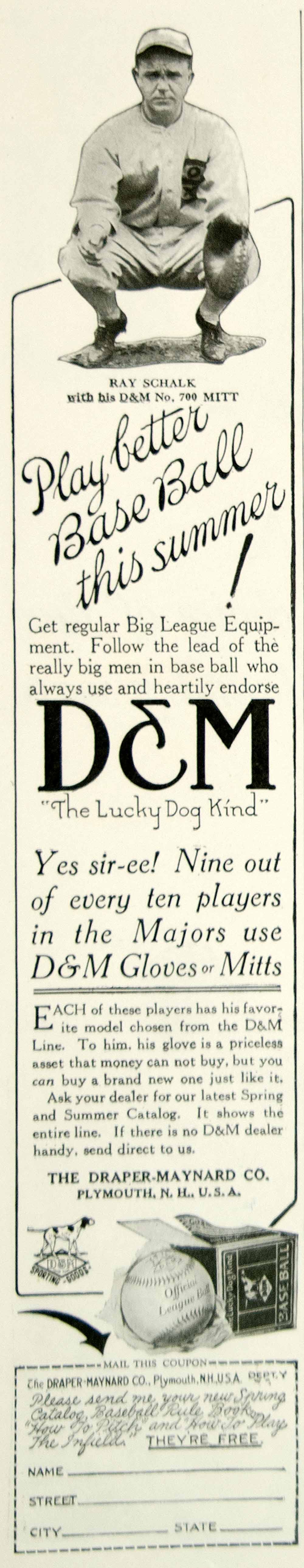 This is an original 1925 black and white print ad for D&M "Lucky Dog" brand baseball gloves and mitts that were made and sold by the Draper-Maynard Co. of Plymouth, New Hampshire (NH) during the Roaring Twenties era. The ad also features an endorsement from professional baseball player, coach, manager, and scout, Raymond William Schalk (1892-1970), who played catcher for the Chicago White Sox major league baseball team from 1912-1928. Schalk was inducted into the Baseball Hall of Fame in 1955.