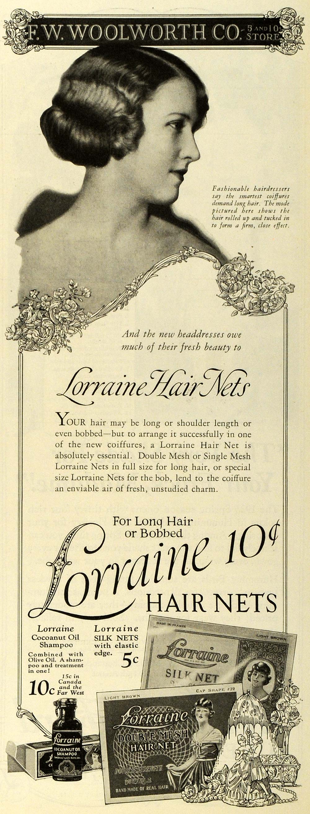 This is an original 1925 black and white print ad for the F. W. Woolworth Company. This ad features their Lorraine Hair Nets, as well as their Cocoanut Oil Shampoo and their specialty Silk Hair Nets with elastic edges.