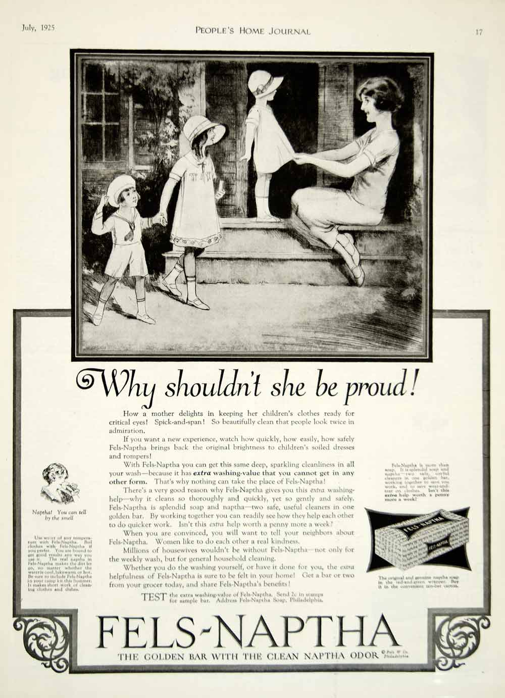 This is an original 1925 black and white print ad for Fels-Naptha Soap that was made and sold by Fels & Company of Philadelphia, Pennsylvania (PA) during the Roaring Twenties era.