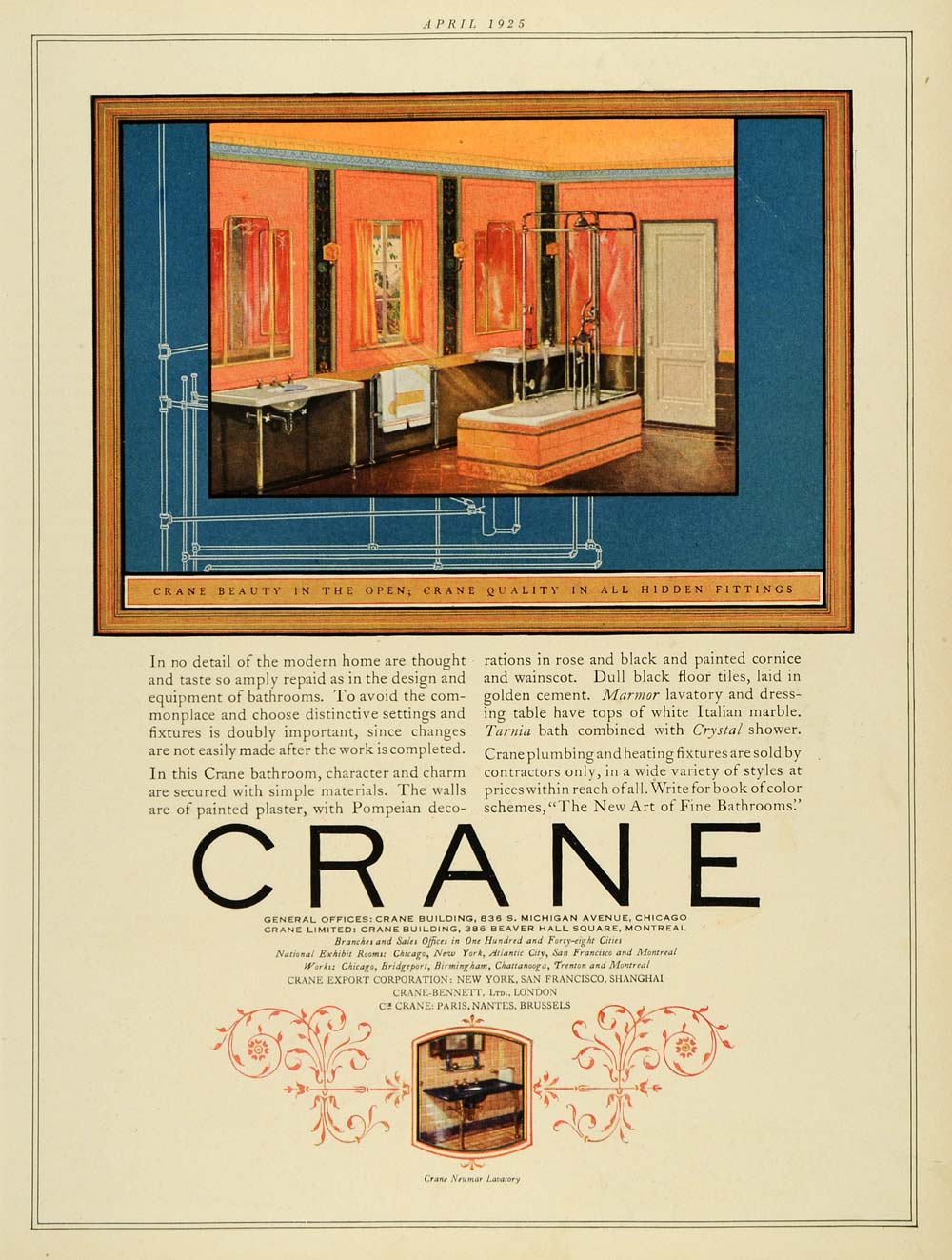 This is an original 1925 color print ad for the Crane Plumbing Fixtures from Crane located at 836 S. Michigan Avenue, Chicago, Illinois.