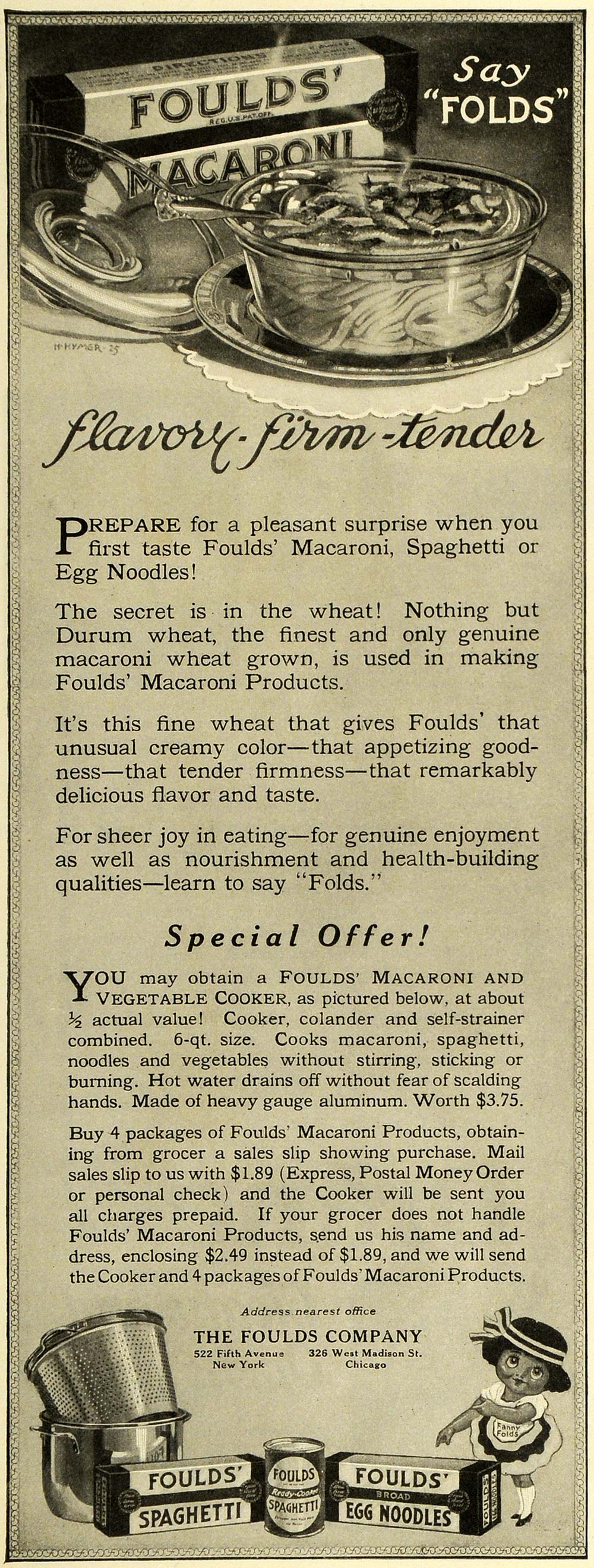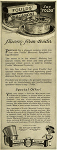 This is an original 1925 black and white print ad for the Foulds Company of 522 Fifth Avenue in New York and 326 West Madison Street in Chicago. This ad features their Foulds' egg noodles, spaghetti, and macaroni.