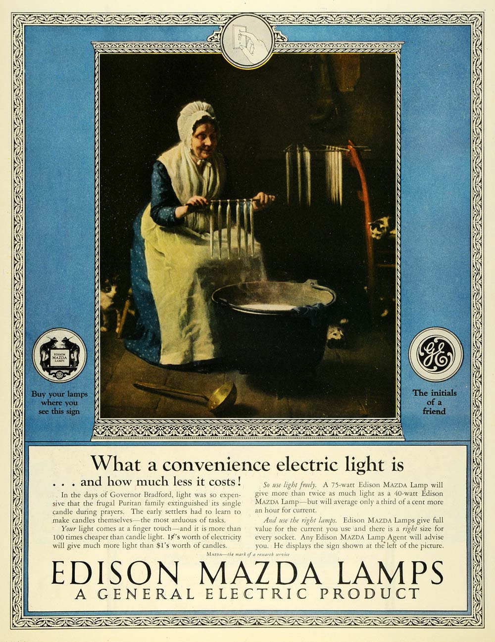 1925 Ad General Electric Edison Mazda Lamps Elderly Woman Wax Candle Maker LHJ7