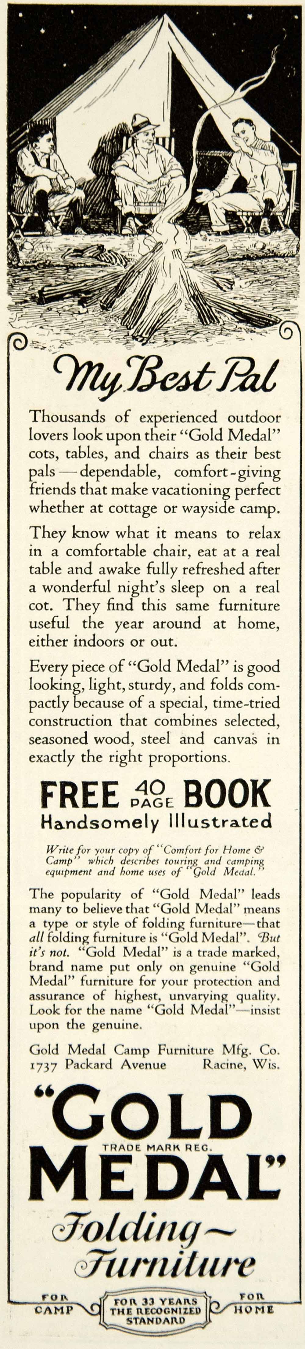 This is an original 1925 black and white print ad for cots, tables, chairs and other camping furniture that was made and sold by the Gold Medal Camp Furniture Manufacturing Company of 1737 Packard Avenue, Racine, Wisconsin (WI).