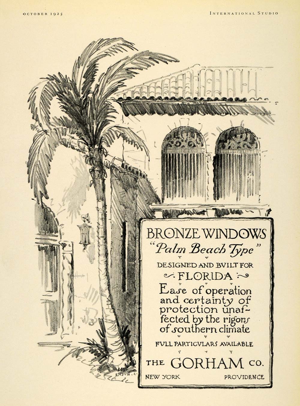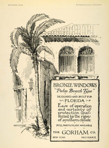 This is an original 1925 black and white print ad for The Gorham Company of New York and Providence, Rhode Island; this ad features their Bronze Windows for home decorating in tropical climates.