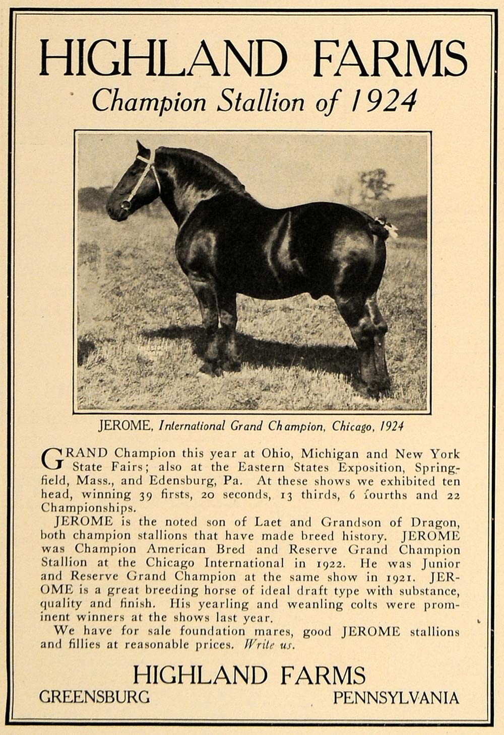 This is an original 1925 black and white print ad for stallions by Highland Farms located in Greensburg, Pennsylvania.