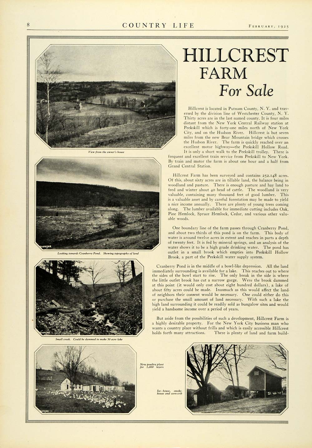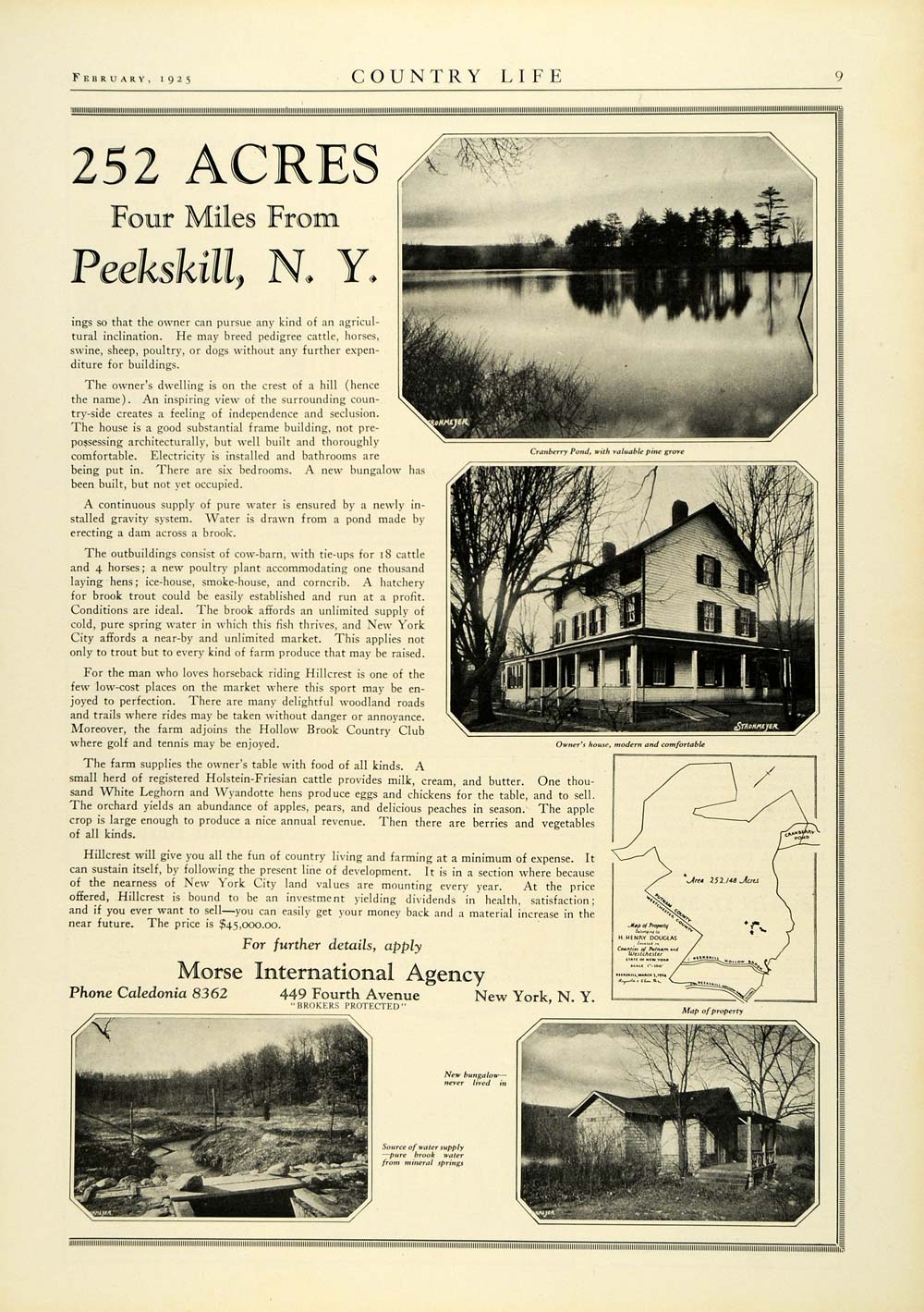 This is an original 1925 black and white two-page print ad for the sale of the Hillcrest Farm in Peekskill of Putnam and Westchester Counties in New York, listed through the Morse International Agency, located at 449 Fourth Avenue in New York City. This ad also features a map of the property by H. Henry Douglas. Please see additional image.