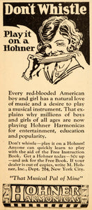 This is an original 1925 black and white print ad for the Hohner Harmonicas distributed by M. Hohner, Inc.., Dept. 204, New York City. You could buy a Hohner for 50 cents and would also be sent a free instruction book.