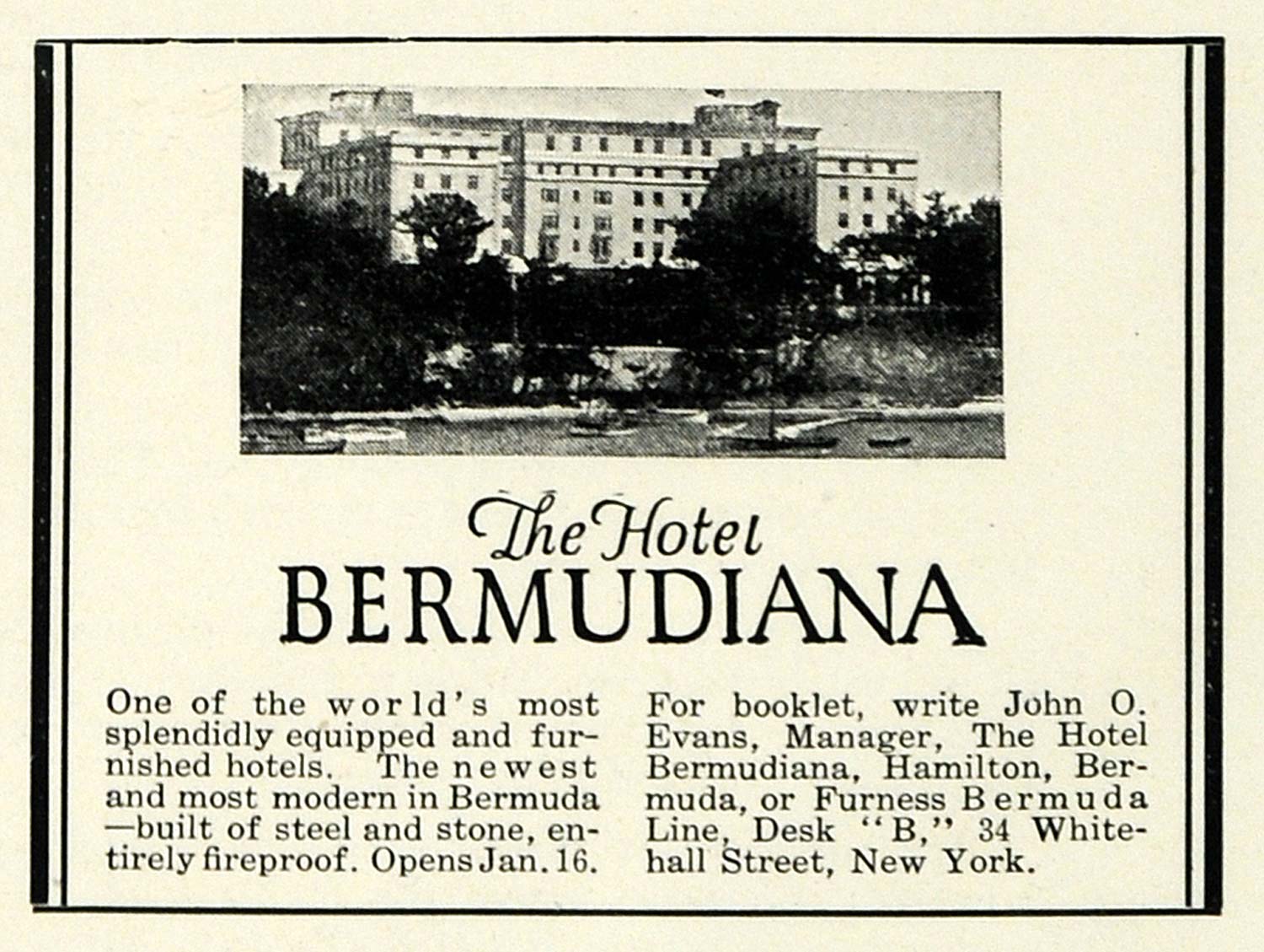 This is a small original 1925 black and white print ad for the Hotel Bermudiana in Hamilton, Bermuda, under John O. Evans management.