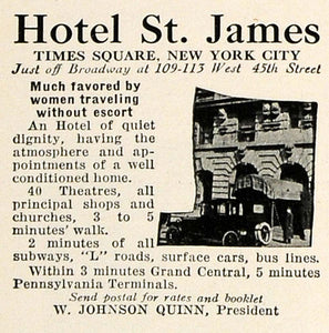 This is a small original 1925 black and white print ad for the Hotel St. James. W. Johnson Quinn was the president at the time.