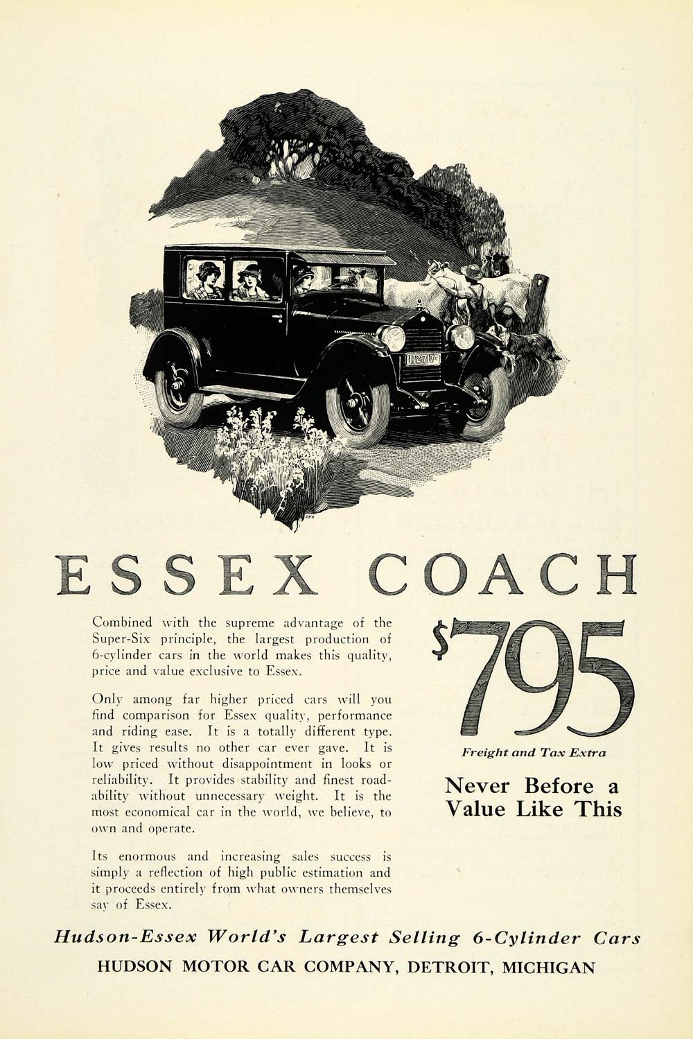 This is an original 1925 black and white print ad for the Hudson Essex Coach Super-Six automobile from Hudson Motor Car Company located in Detroit, Michigan.