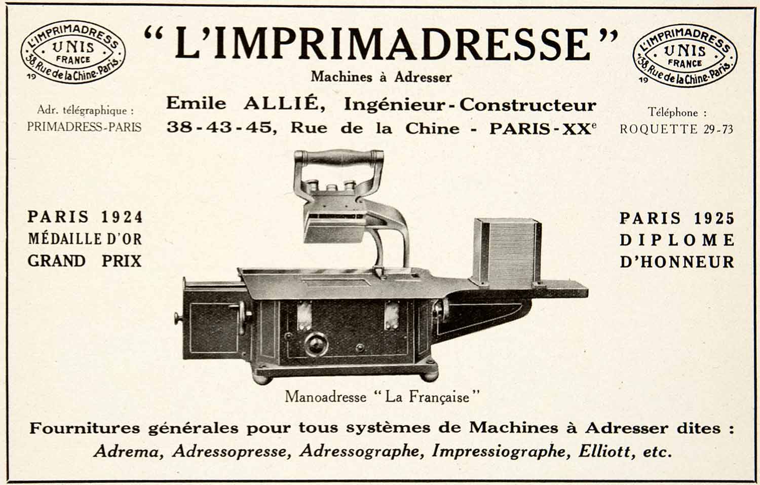 This is an original 1925 black and white print ad for the Imprimadresse, a printing press designed by French engineer Emile Allié, located at 38 rue de la Chine, Paris.