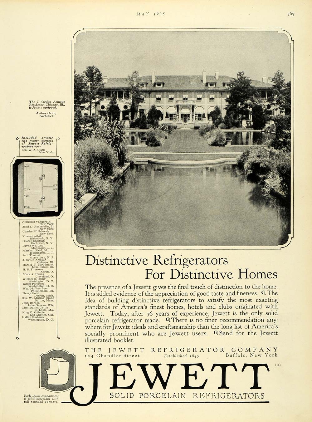 This is an original 1925 black and white print ad for Jewett Solid Porcelain Refrigerators from Jewett Refrigerator Company located at 124 Chandler Street, Buffalo, New York. This ad features an image of the residence of Jonathan Ogden Armour located in Chicago, Illinois, by the architect Arthur Heun.