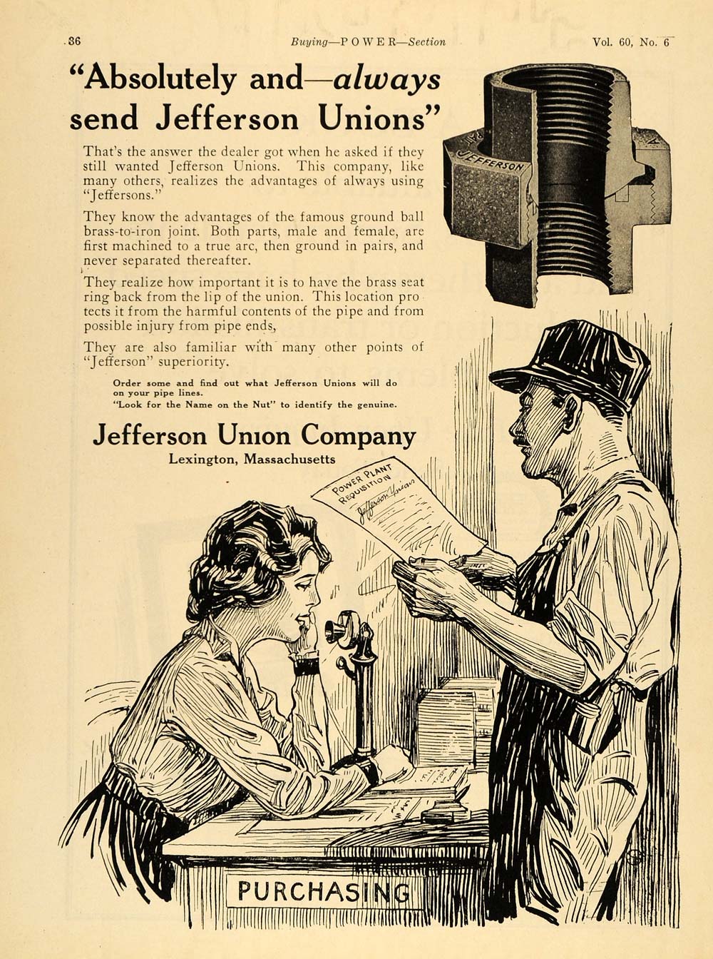 This is an original 1925 black and white print ad for Jefferson union Company located in Lexington, Massachusetts.