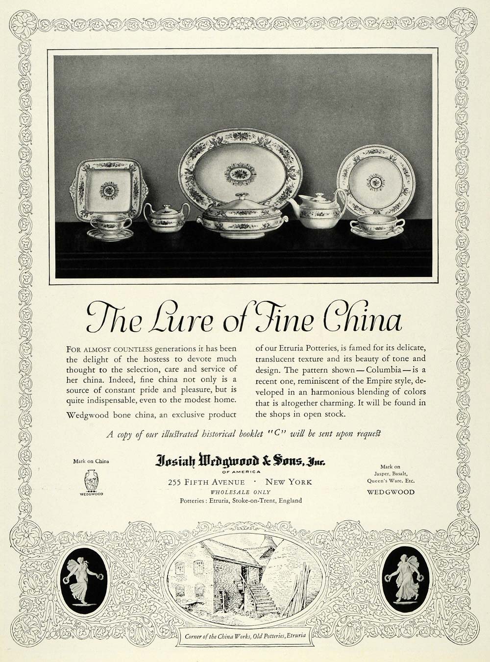 This is an original 1925 black and white print ad for Josiah Wedgwood & Sons' line of Fine China. The pattern featured is Columbia, which is reminiscent of the Empire style.