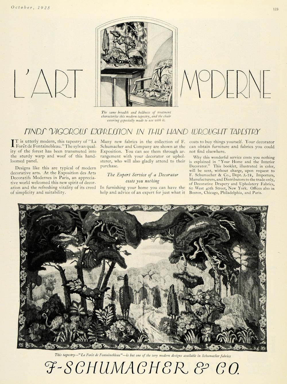 This is an original 1925 black and white print ad for F. Schumacher & Company. The advertisement features an image of a tapestry titled, "La Foret de Fontainebleau."