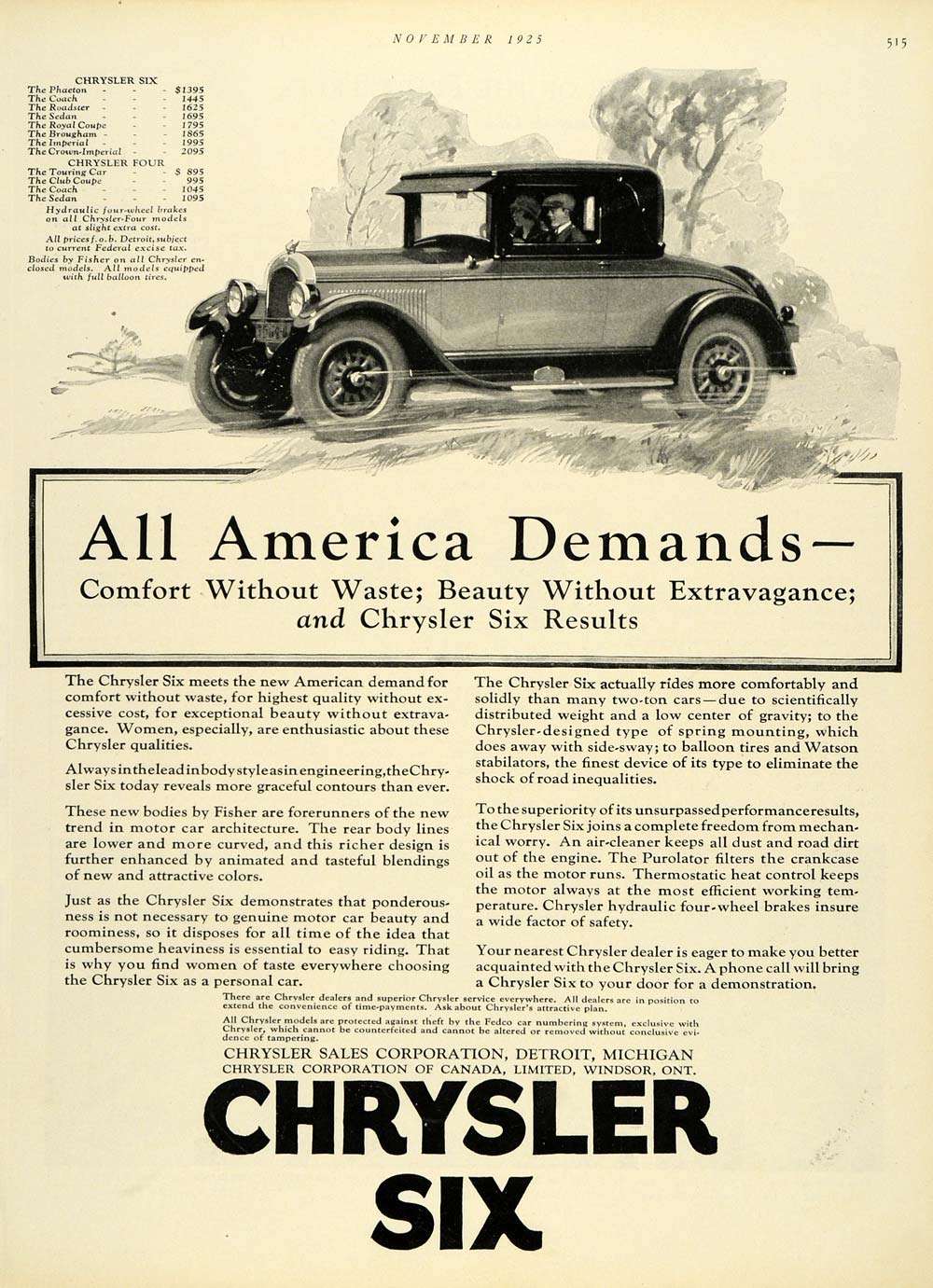 This is an original 1925 black and white print ad for the Chrysler Six Automobile from Chrysler Group LLC.