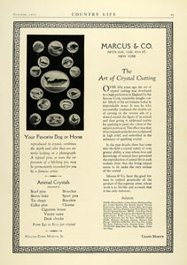 This is an original 1925 black and white print ad for animal crystals from Marcus & Company of Fifth Avenue and 45th Street, New York. The company offered animal crystals mounted in brooches, scarf pins, sleeve links, tie clasps, bracelets and various others.