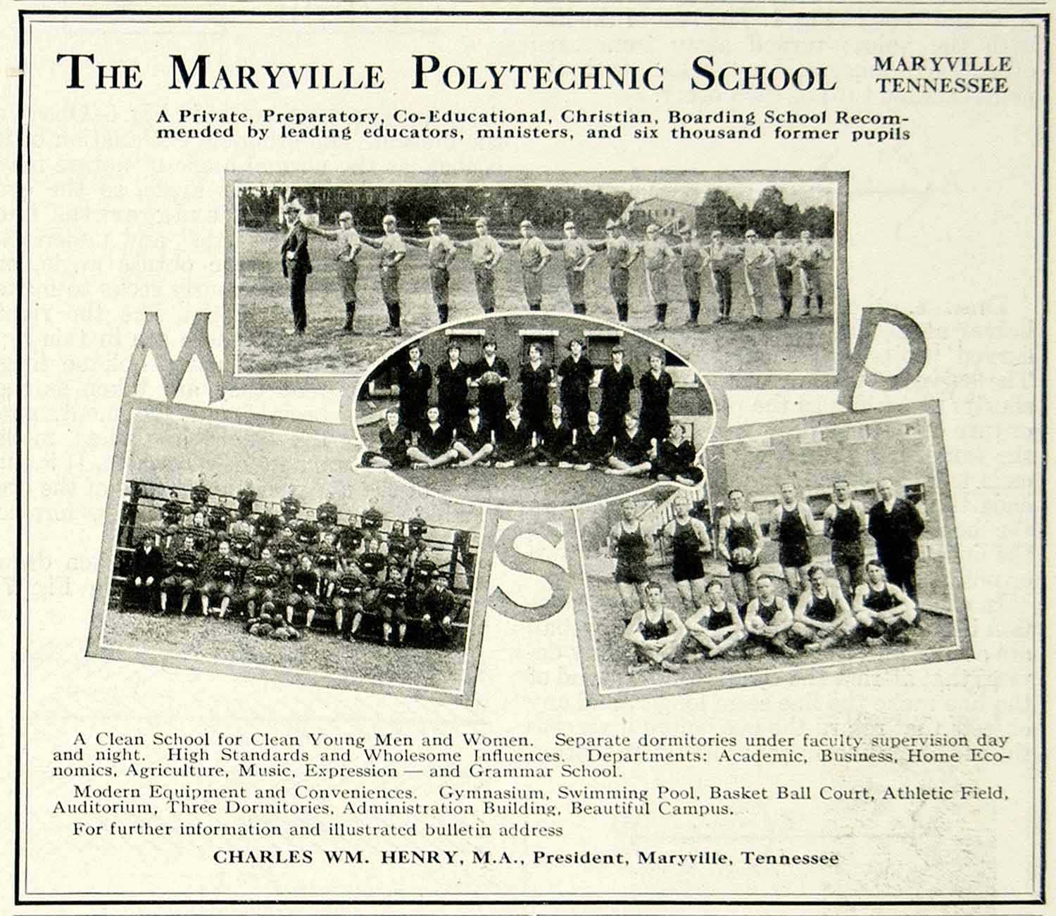 This is an original 1925 black and white print ad for the Maryville Polytechnic School of Maryville, Tennessee, USA during the Roaring Twenties era. The ad also lists Charles William Henry, M.A., ad President of the School.