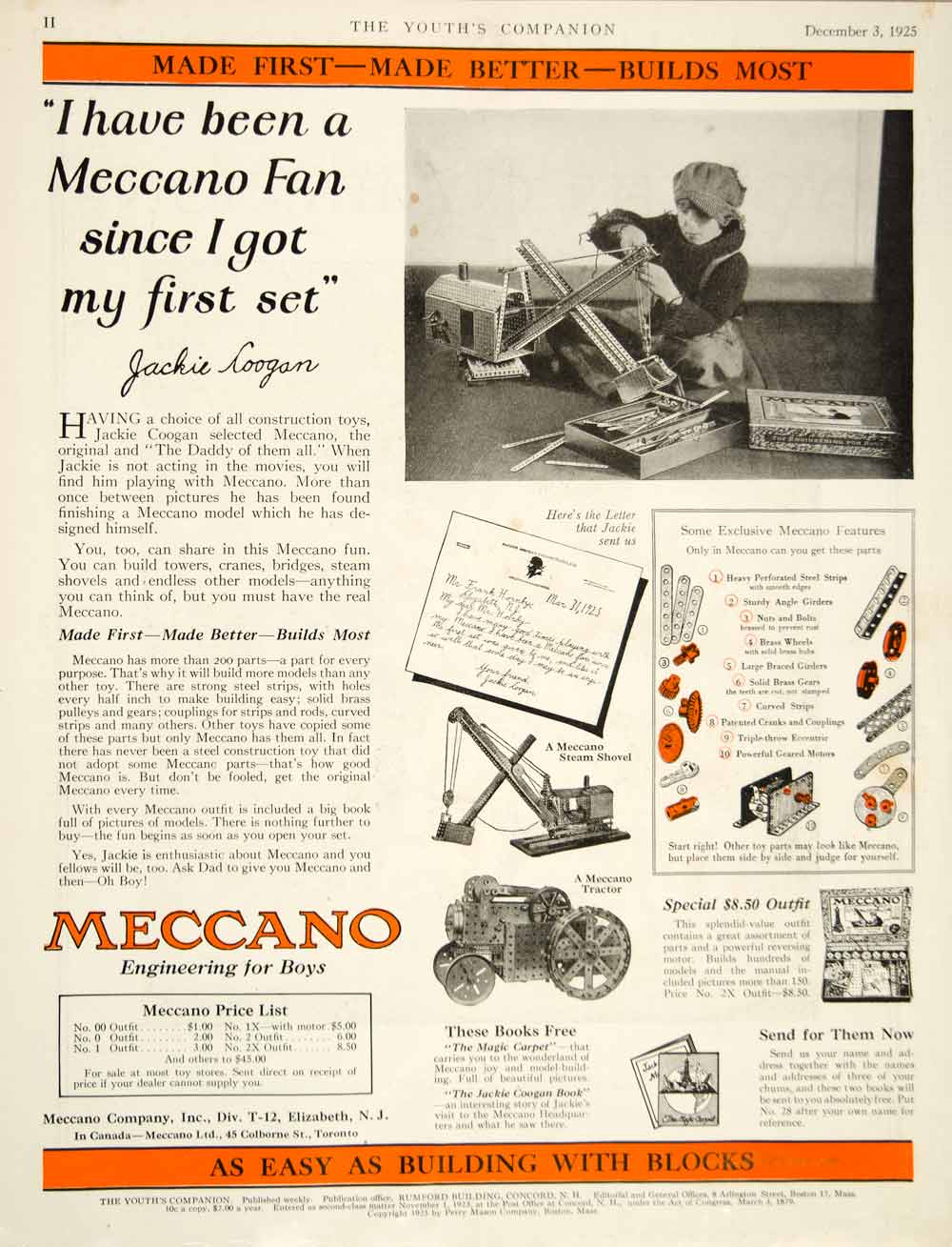 This is an original 1925 two-color print ad for children's construction and building toy sets that were made and sold by the Meccano Company, Inc., of Elizabeth, New Jersey (NJ) during the Roaring Twenties era. The ad also features a celebrity endorsement from child actor John Leslie "Jackie" Coogan (1914-1984).