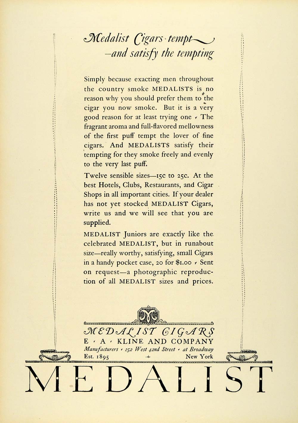 This is an original 1925 black and white print ad for the Medalist Cigars from E. A. Kline and Company located at 152 West 42nd Street, Broadway, New York City.