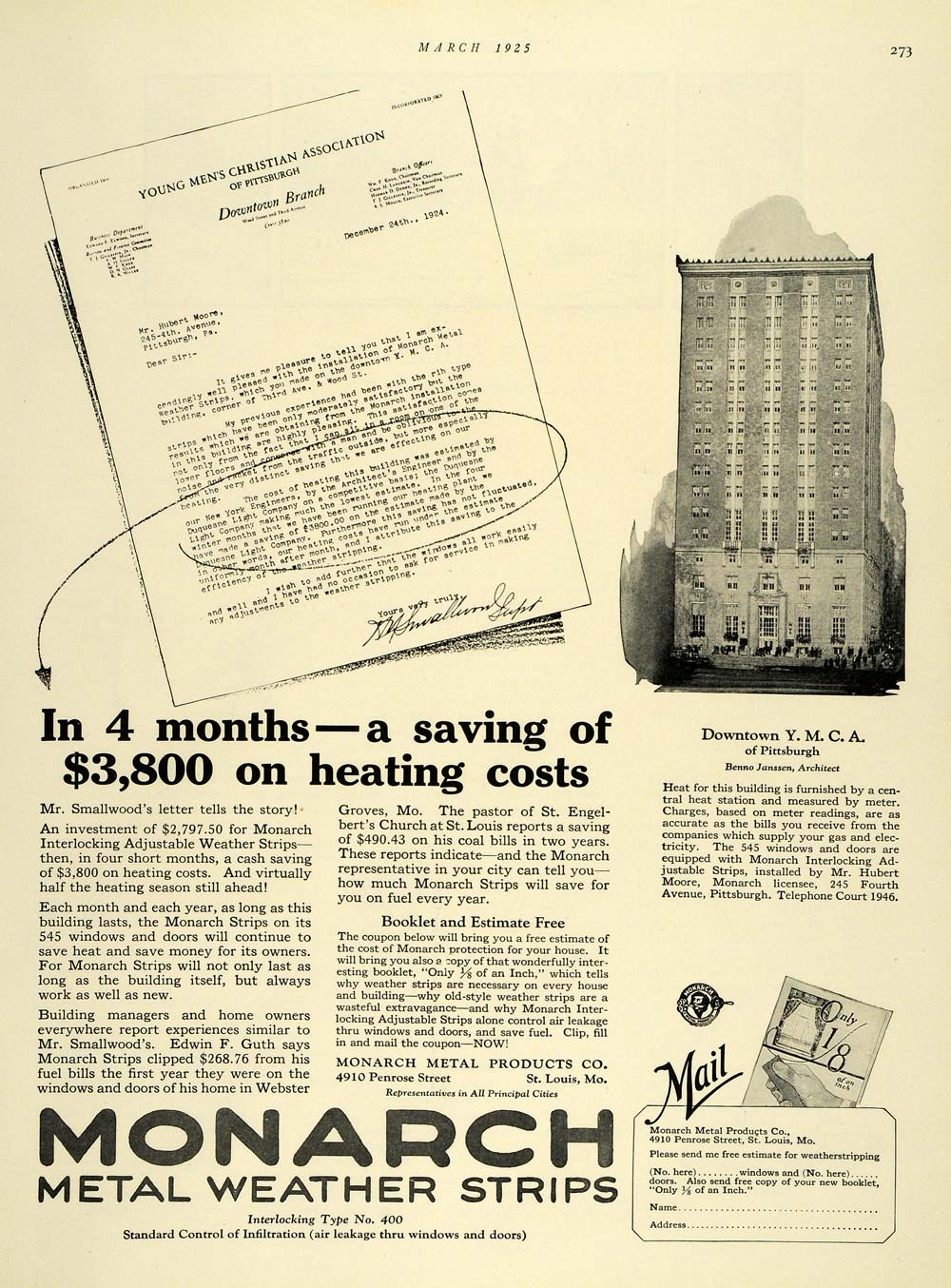 Keywords specific to this image: Vintage Advertising, Architecture, Home Building, Home Improvement, Construction, Home Heating, Mr. Smallwood, Hubert Moore, Young Men's Christian Association, Edwin F. Guth, Webster Groves Missouri, St. Engelbert's Church St. Louis, 4910 Penrose Street St. Louis Missouri