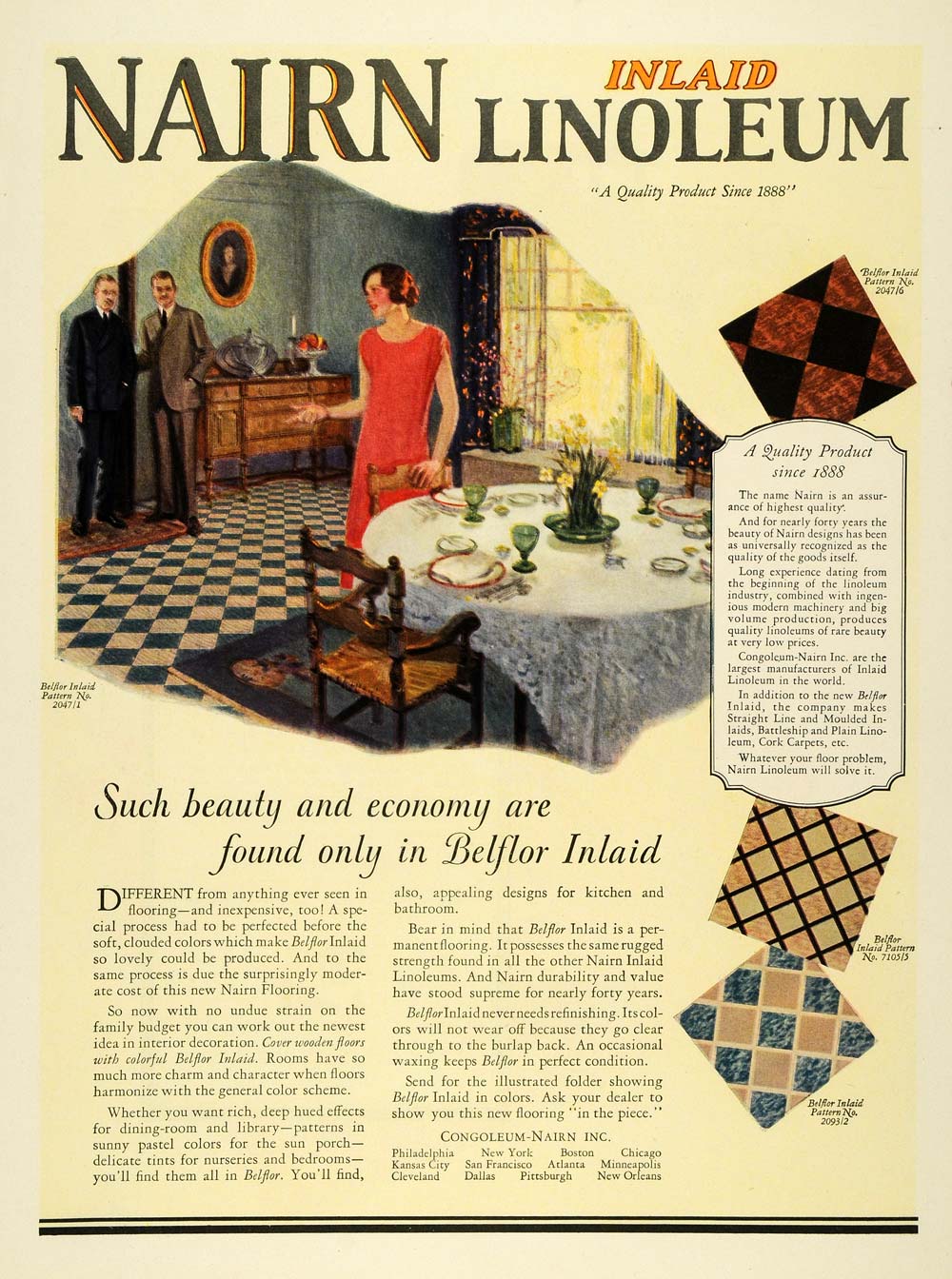 This is an original 1925 color print ad for the Congoleum-Nairn Incorporation. The ad features images of the pattern numbers 2047/1, 2093/2, 7105/5, and the 204716.
