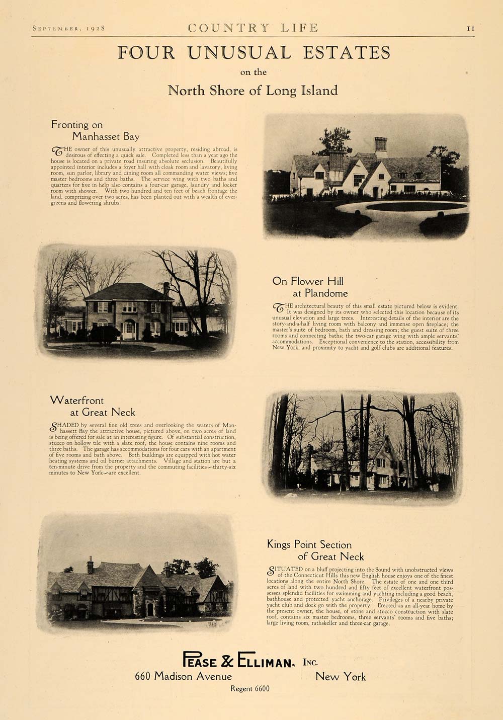 This is an original 1925 black and white print ad for Pease & Elliman's Long Island estates, specially featuring Kings Point Section of Great Neck, Waterfront at Great Neck, Flower Hill at Plandome and Fronting on Manhasset Bay.