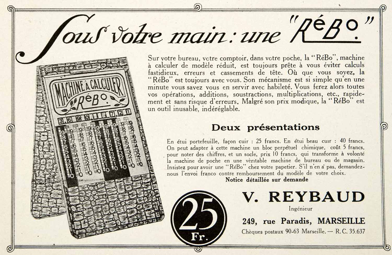 This is an original 1925 black and white print ad for the RéBo, an ingenious calculating device which could be purchased from 249 rue Paradis, Marseille.