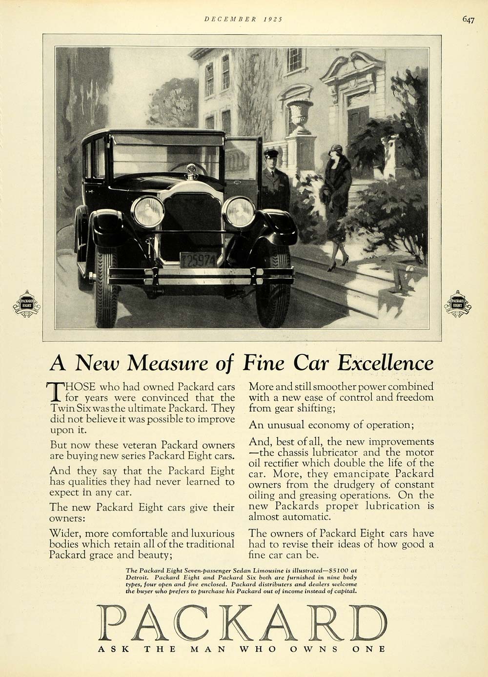 This is an original 1925 black and white print ad for the Packard Eight Seven-passenger Sedan Limousine from Packard Motor Car Company.