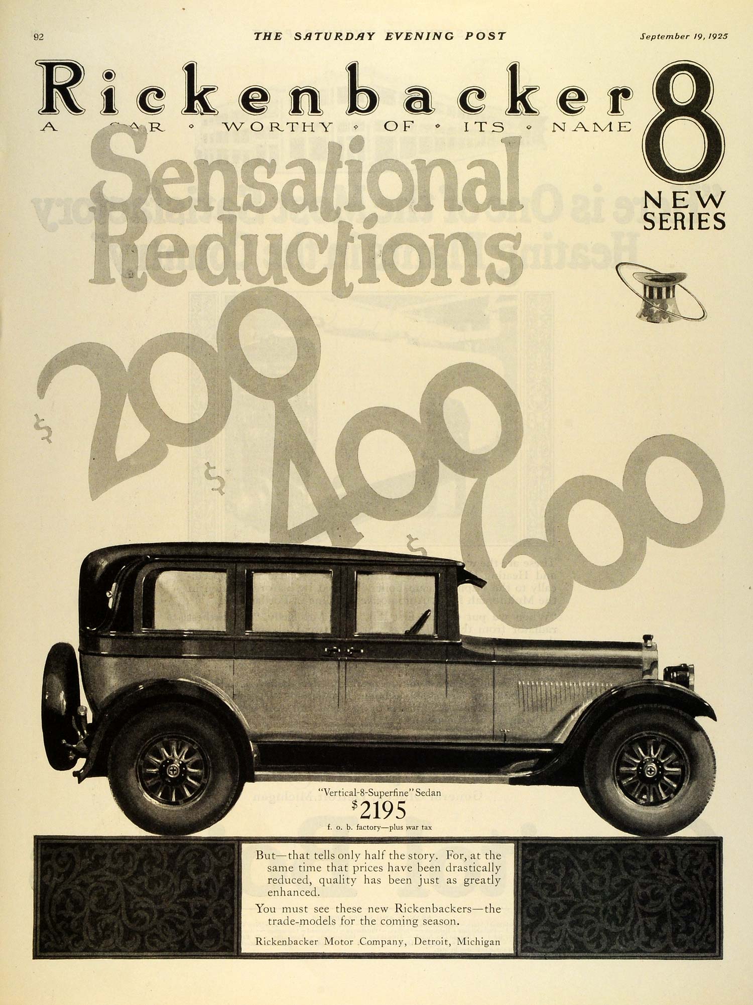 This is an original 1925 black and white print ad for the "Vertical-8-Superfine" Sedan by the Rickenbacker Motor Company of Detroit, Michigan.