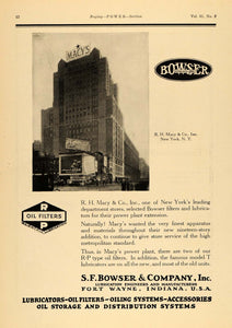 This is an original 1925 black and white print ad for S. F. Bowser & Company, Inc. of Fort Wayne, Indiana. Pictured in the ad is R. H. Macy & Co., Inc. of New York, NY.