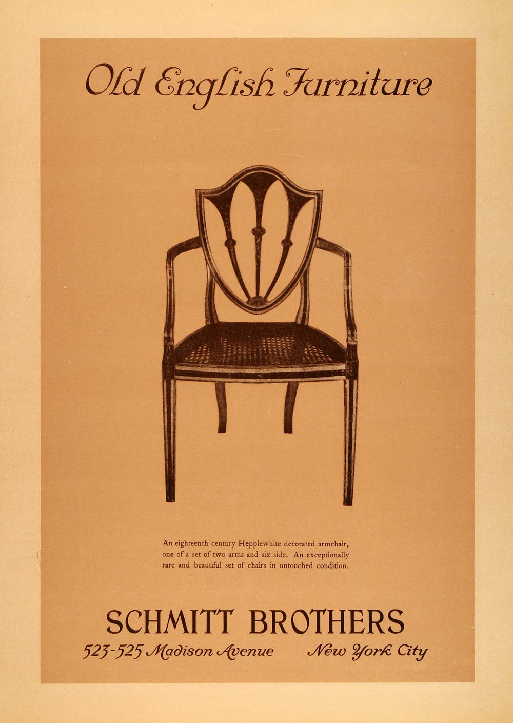 This is an original 1925 color print ad for the Schmitt Brothers of 523 - 525 Madison Avenue in New York City; this ad features their Old English Furniture for the home.